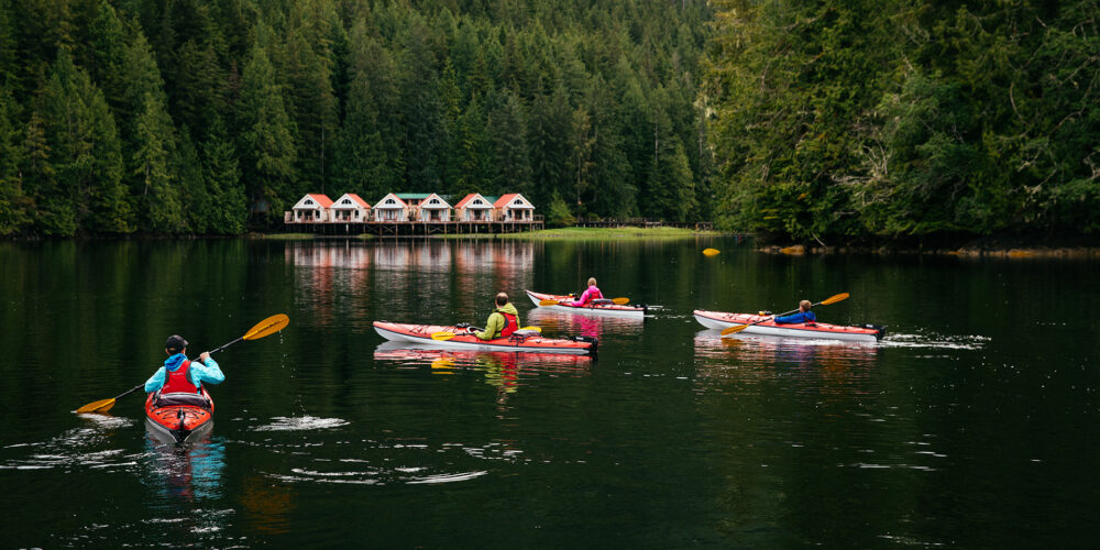 Scenic flight into the Great Bear Rainforest, Wildlife viewing, Kayaking, Paddleboarding, Leisure time in a floating sauna, Jet boat tour, Guided hikes